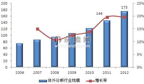 前瞻產(chǎn)業(yè)院《2013-2017年中國體外診斷行業(yè)市場需求預(yù)測與投資戰(zhàn)略規(guī)劃分析報告》數(shù)據(jù)顯示,2006年以來,國內(nèi)體外診斷產(chǎn)業(yè)以15%左右的年增長率呈現(xiàn)高速增長態(tài)勢。據(jù)統(tǒng)計,2008年我國體外診斷市場規(guī)模已達95億元,2010年增長至122億元,2011年突破140億元,到2012年,我國體外診斷市場規(guī)模約為175億元。