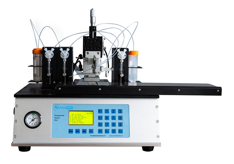 噴金標(biāo)機(jī)應(yīng)用于生產(chǎn)過程中均勻地把膠體金,熒光微球,量子點等顆粒均勻地噴在聚酯膜,玻纖等材料上。進(jìn)口噴筆保證線條均勻性,是中大型企業(yè)必備的生產(chǎn)設(shè)備之一。