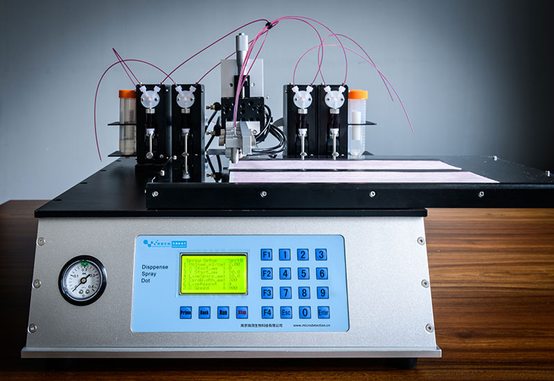 大平臺(tái)多通道噴金標(biāo)機(jī)應(yīng)用于生產(chǎn)過(guò)程中均勻地把膠體金,熒光微球,量子點(diǎn)等顆粒均勻地噴在聚酯膜,玻纖等材料上。相比于傳統(tǒng)的噴金機(jī),效率大大提高,是特大型企業(yè)必備的生產(chǎn)設(shè)備之一。